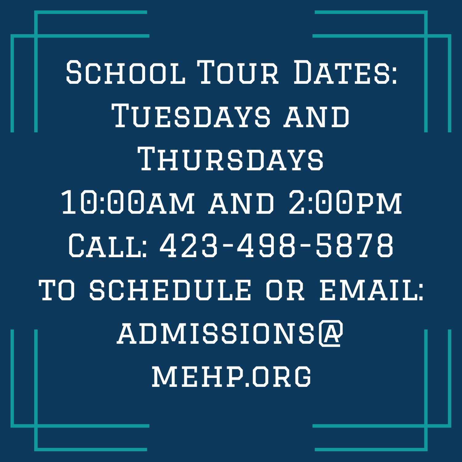 We proudly welcome prospective students and their families to tour our wonderful school. School tours are offered on Tuesdays and Thursdays at 10:00 a.m. and 2:00 p.m. Tours will be limited in number to minimize disruption. Tours will last approximately 30 minutes. Please contact Admissions at admissions@mehp.org or 423.498.5878 to schedule a tour.